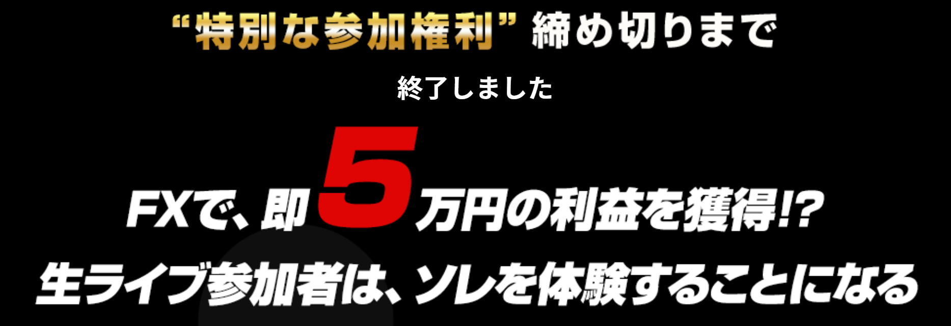 | 表現、及び商品に関する注意書き | 本ページに示された表現や再現性には個人差があり、必ずしも利益や効果を保証したものではございません。 また、本セミナー終了後に当運営事務局から有料サービスのご案内があります。 |