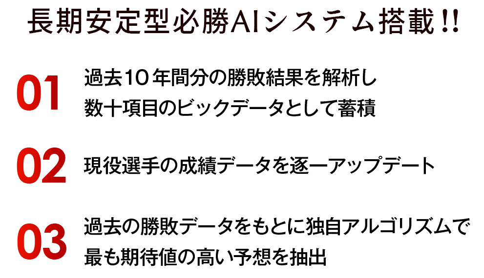 メリット01.毎月20万以上の安定収入 体験者52名が全員毎月20万円以上の現金を受け取っています。 メリット02.過去10年分の勝敗データ分析 過去10年間の膨大な情報、勝敗データをまとめて過去の傾向から次の動きを予想します。 メリット03.手間がかからない 週に2回のうち1回の作業時間はたったの3分!仕事や家事で忙しい方でも大丈夫です。 メリット04.小資金で問題ありません 最低運用資金は100円からでもokです!資金がない人でも少ない金額から始めることが可能です。体験者52名が毎月20万以上と書いてありますが、そのデータや根拠などは一切ありませんね。
